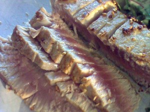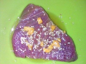 Marineer de tonijnsteaks in olijfolie, met citroengras (poeder) een fijngesneden pepertje en sesamzaadjes.