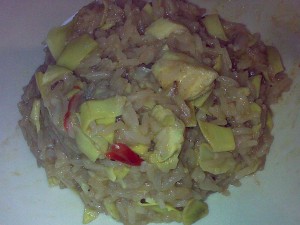 Dit rijstgerecht is gebaseerd op risotto met palmboomharten. De smaak van palmboomharten komt sterk overeen met artisjokken (*) die hier iets makkelijker verkrijgbaar zijn. Artisjokkenhartjes uit blik voldoen prima en zijn al gekookt dus worden vrijwel aan het einde toegevoegd. Bijgerecht voor twee à drie personen.