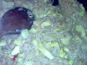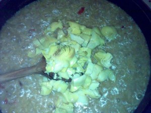 Dit doen we zo’n 30min, tot de rijst de juiste consistentie heeft voor risotto, waarop we enkele gesneden artisjokkenhartjes toevoegen.