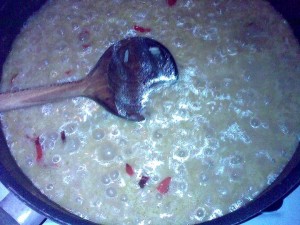 Vervolgens voegen we de gedroogde kokosmelk (santen) en de boter toe.